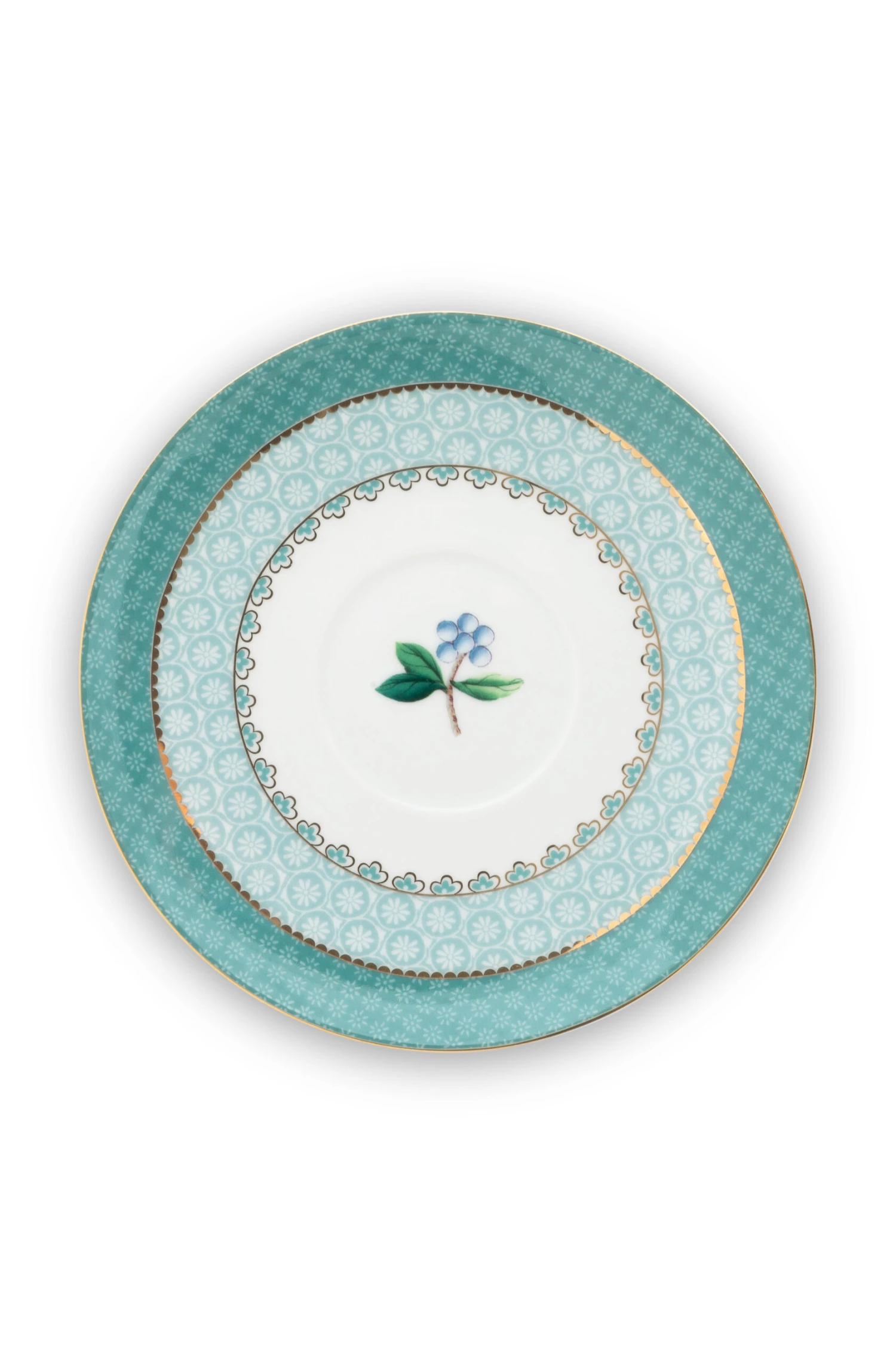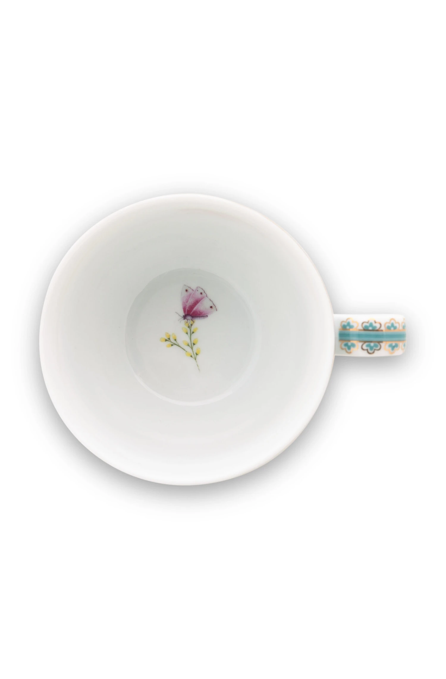 Diese blaue Tasse mit Untertasse aus der mit exotischen Blumen, Vögeln und goldenen Details verzierte Kollektion überzeugt mit liebevollen Details. Blumen fallen etwas über die Ränder, im Inneren von Schalen setzen sich Elemente aus dem Dessin fort.