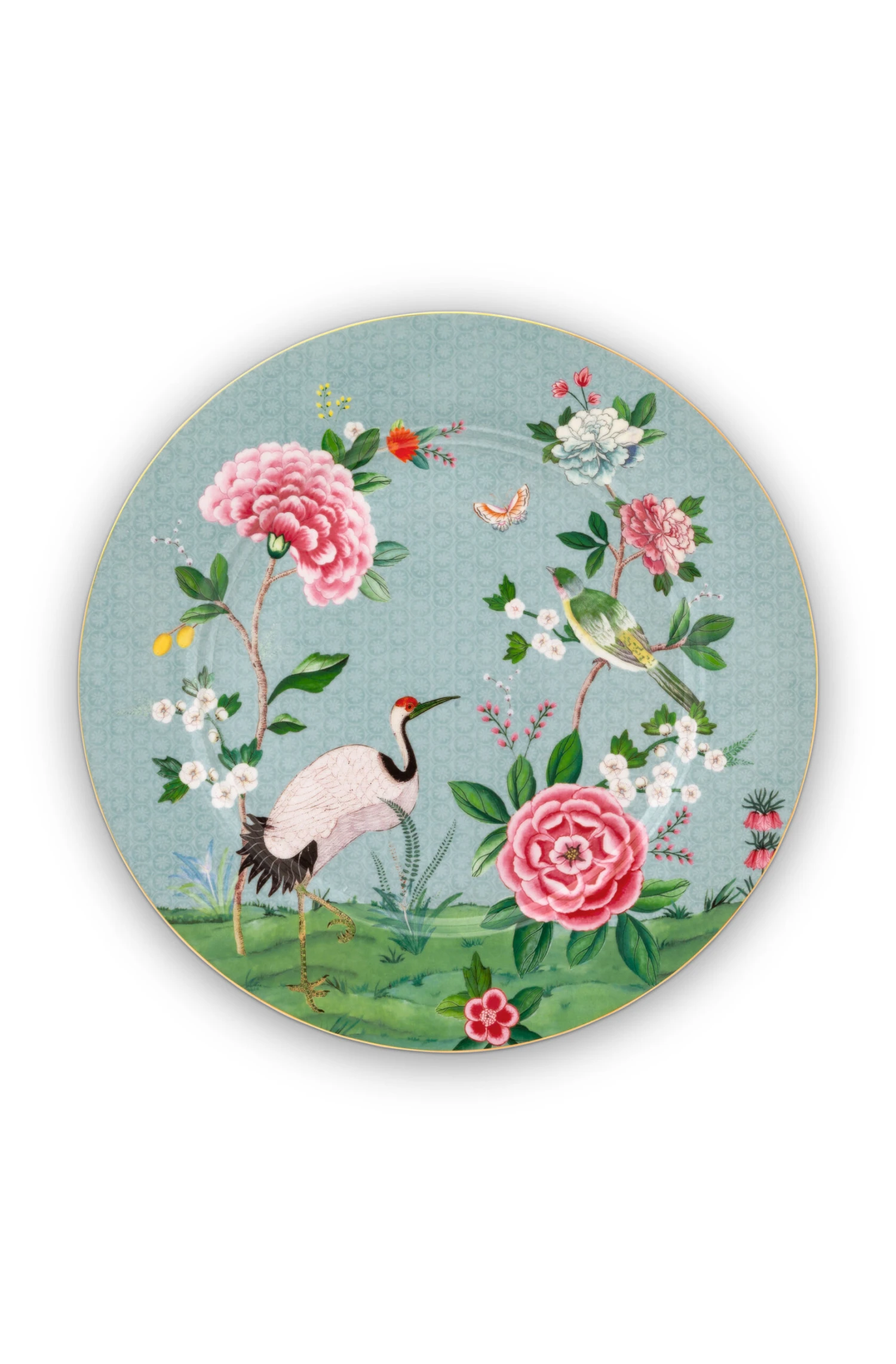 Dieser blaue Teller aus der mit exotischen Blumen, Vögeln und goldenen Details verzierte Kollektion überzeugt mit liebevollen Details. Blumen fallen etwas über die Ränder, im Inneren von Schalen setzen sich Elemente aus dem Dessin fort.