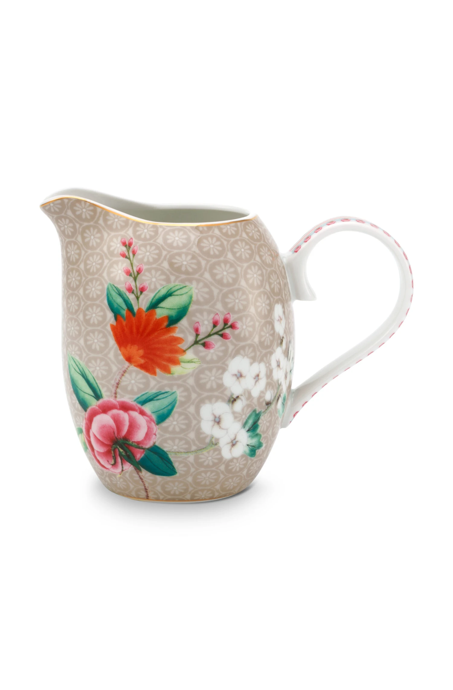 Diese kleine khakifarbene Kanne aus der mit exotischen Blumen, Vögeln und goldenen Details verzierte Kollektion überzeugt mit liebevollen Details. Blumen fallen etwas über die Ränder, im Inneren von Schalen setzen sich Elemente aus dem Dessin fort. Ideal als Milchkännchen geeignet!