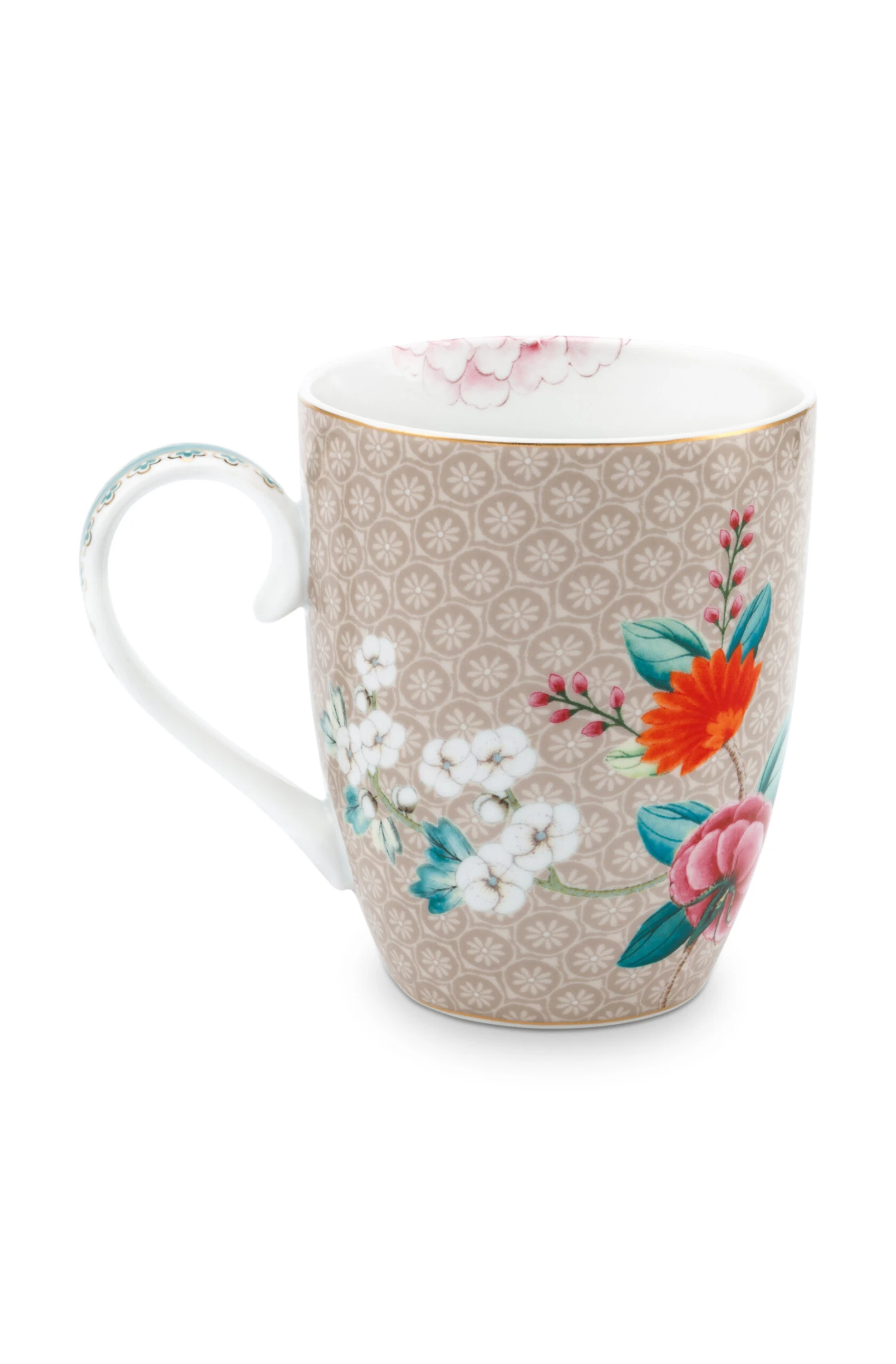 Diese große khakifarbene Tasse aus der mit exotischen Blumen, Vögeln und goldenen Details verzierte Kollektion überzeugt mit liebevollen Details. Blumen fallen etwas über die Ränder, im Inneren von Schalen setzen sich Elemente aus dem Dessin fort.