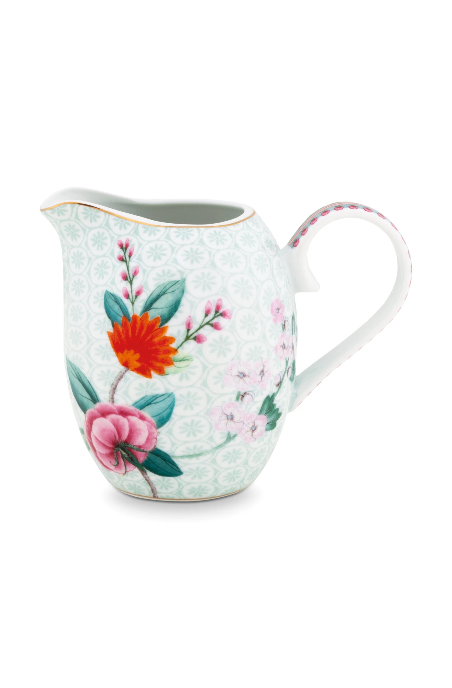 Diese kleine weiße Kanne aus der mit exotischen Blumen, Vögeln und goldenen Details verzierte Kollektion überzeugt mit liebevollen Details. Blumen fallen etwas über die Ränder, im Inneren von Schalen setzen sich Elemente aus dem Dessin fort.