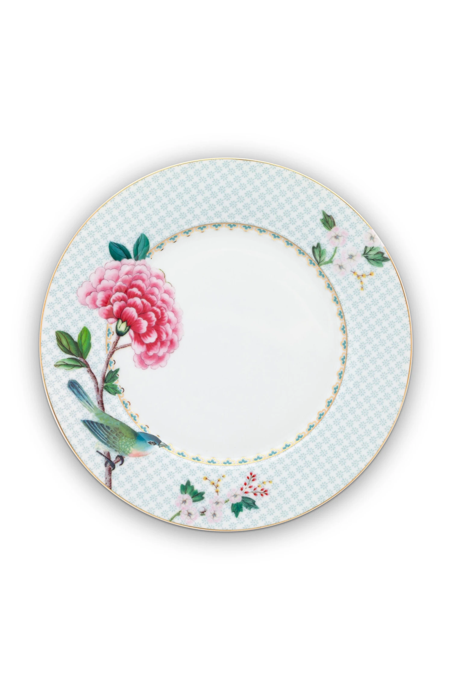 Dieser weiße Teller aus der mit exotischen Blumen, Vögeln und goldenen Details verzierte Kollektion überzeugt mit liebevollen Details. Blumen fallen etwas über die Ränder, im Inneren von Schalen setzen sich Elemente aus dem Dessin fort.