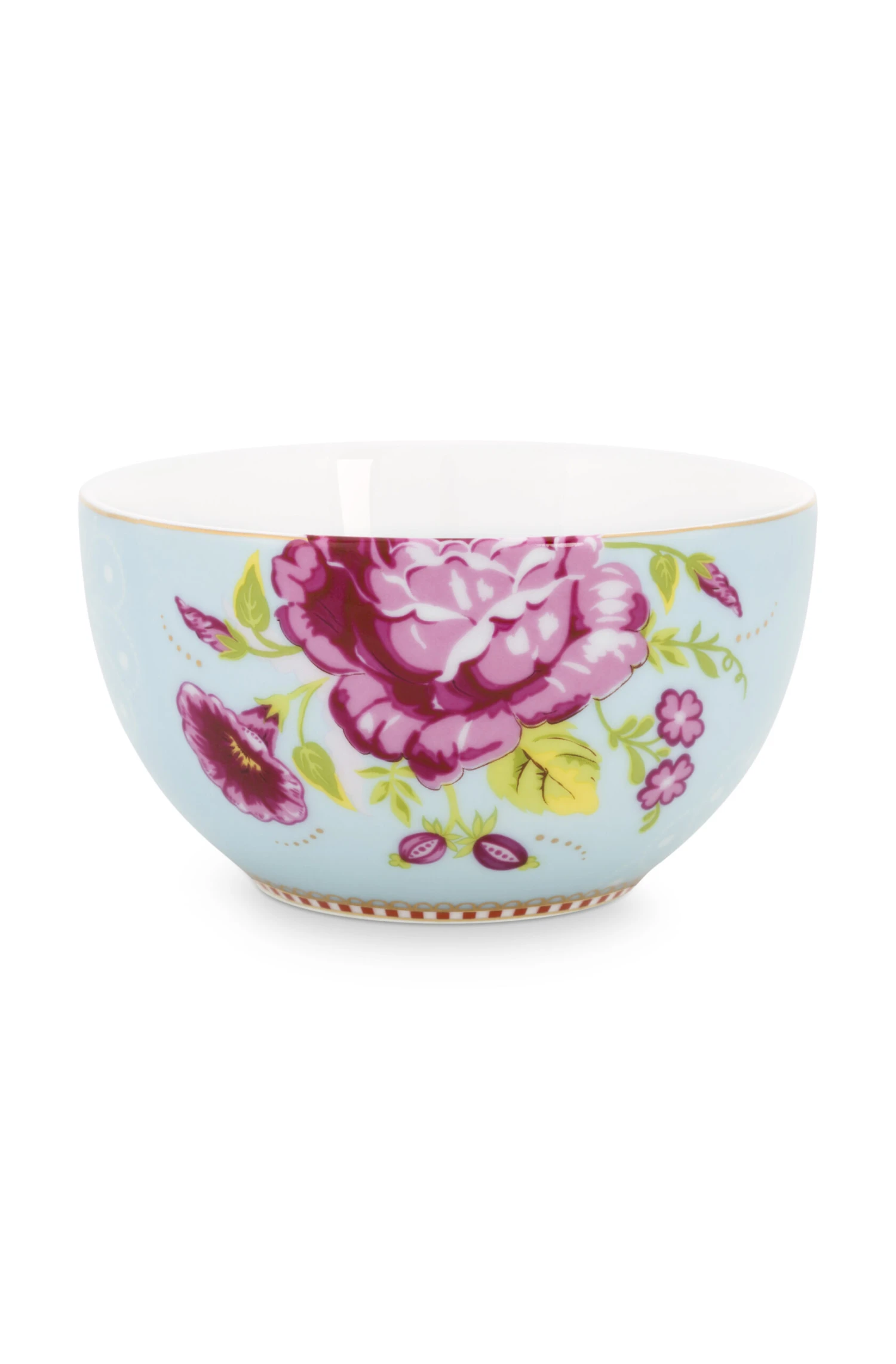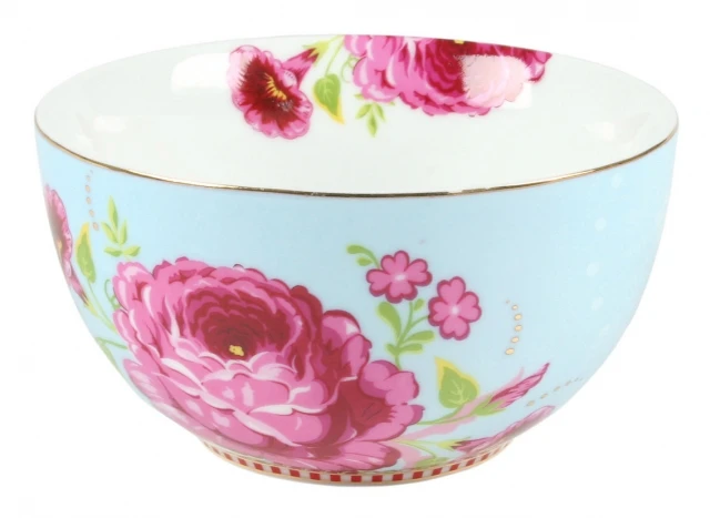 Diese schöne blaue Schale wurde mit dem Early Bird Dessin dekoriert: ein Vogel, detaillierter Blütenprint auf Außen- und Innenseite, goldene Details und der typisch rot-weiß gestreifte Pip-Studio-Rand.