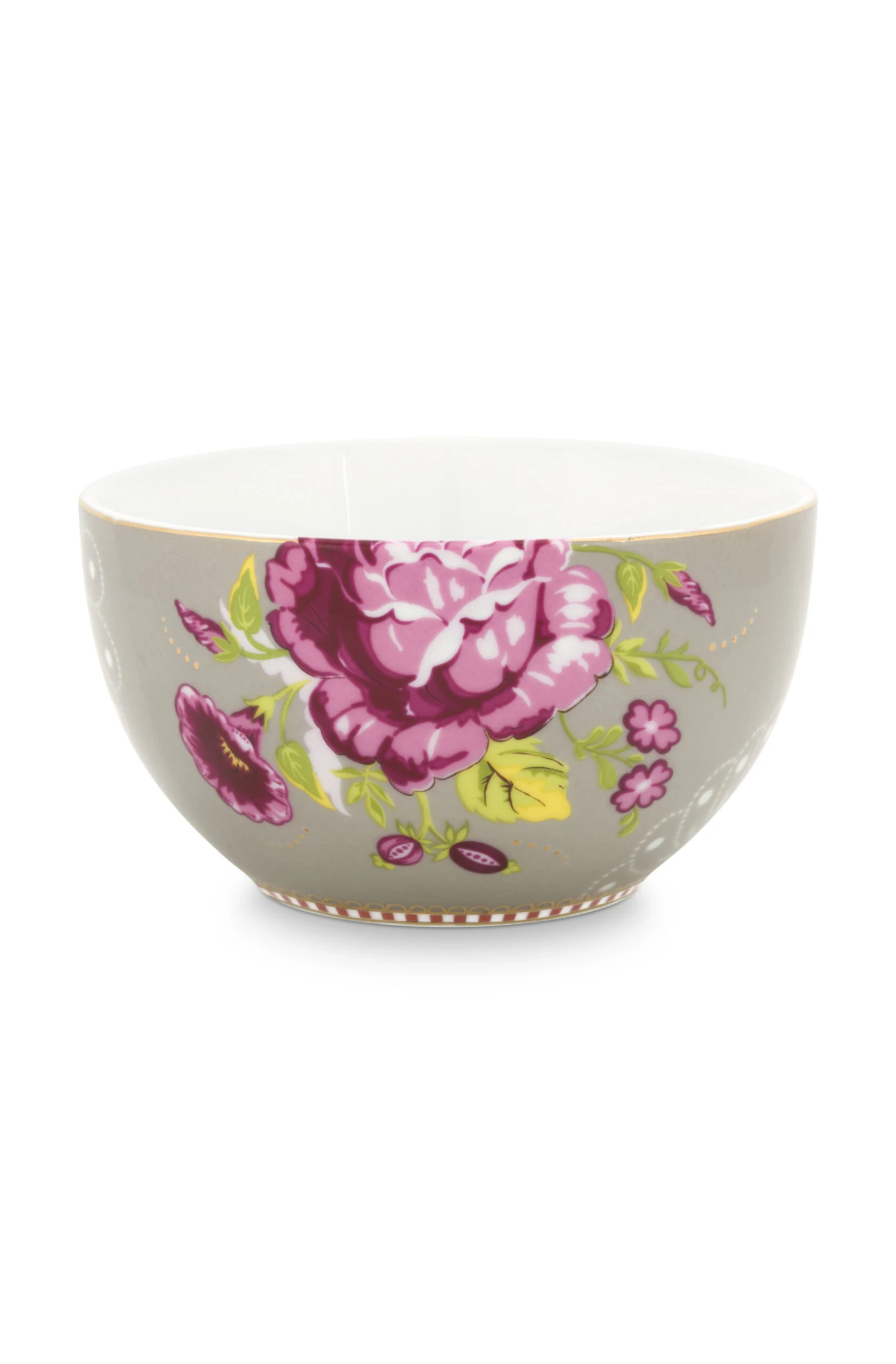 Diese schöne khakifarbene Schale wurde mit dem Early Bird Dessin dekoriert: ein Vogel, detaillierter Blütenprint auf Außen- und Innenseite, goldene Details und der typisch rot-weiß gestreifte Pip-Studio-Rand.