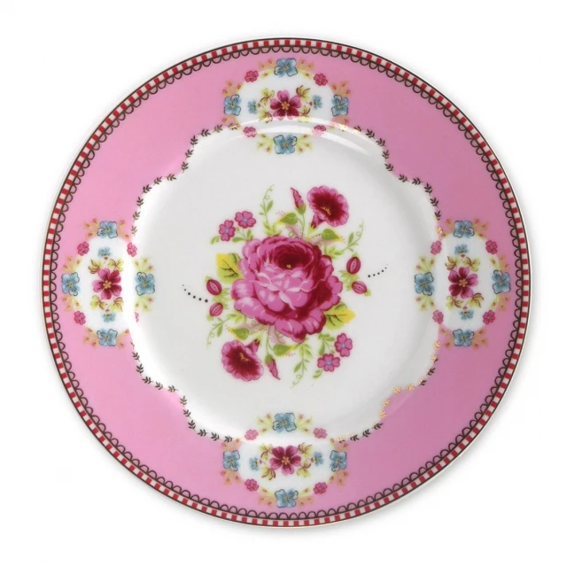 Dieser schöne pinkfarbene Teller wurde mit dem Early Bird Dessin dekoriert: ein Vogel, detaillierter Blütenprint auf Außen- und Innenseite, goldene Details und der typisch rot-weiß gestreifte Pip-Studio-Rand.