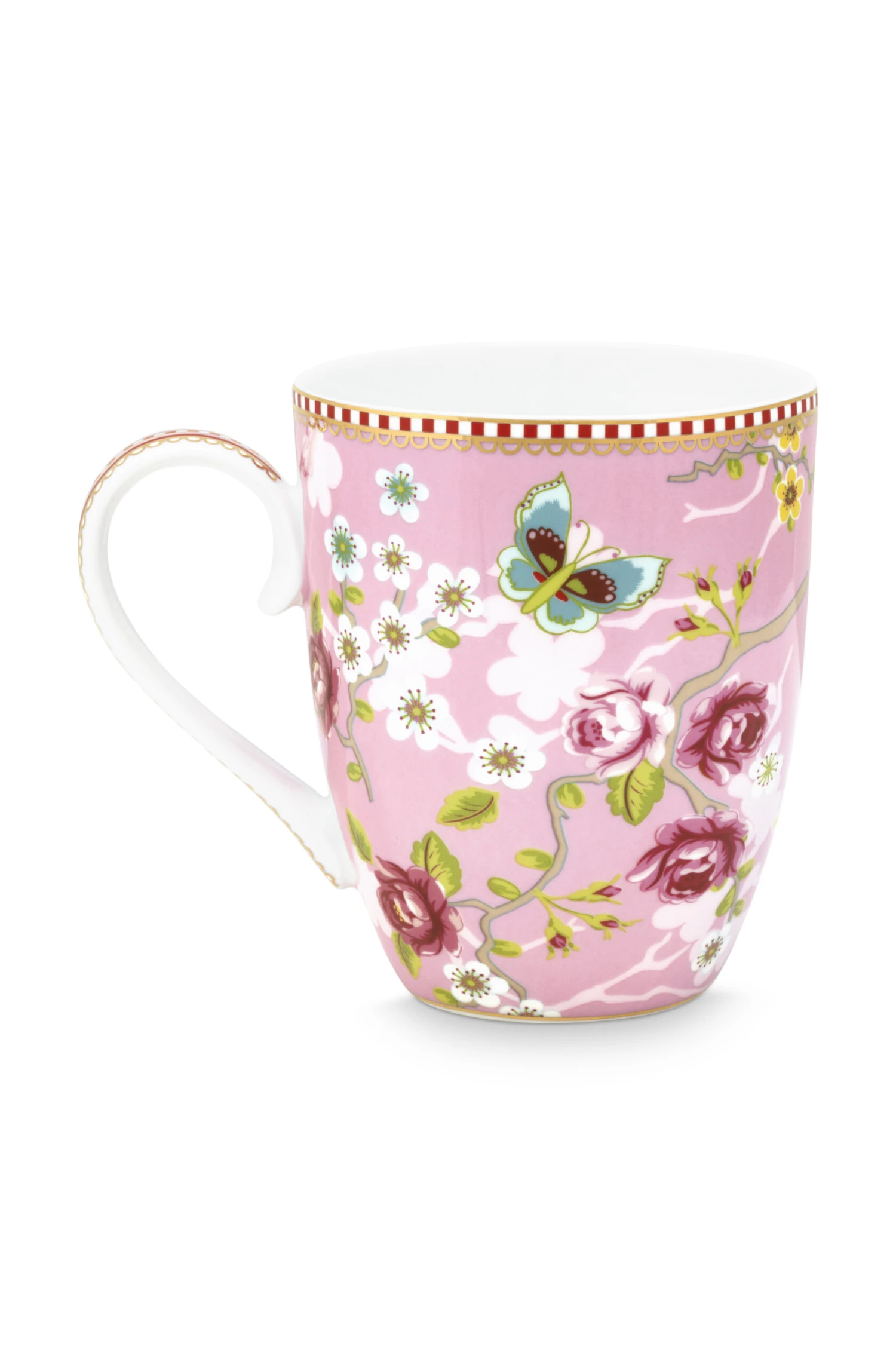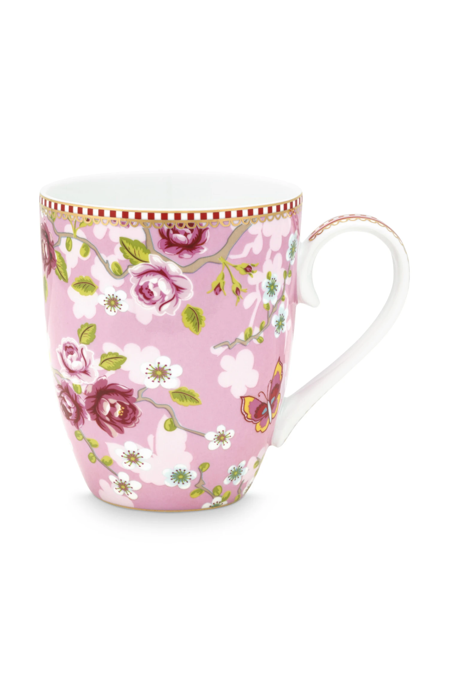 Diese schöne pinkfarbene, große Tasse wurde mit dem Early Bird Dessin dekoriert: ein Vogel, detaillierter Blütenprint auf Außen- und Innenseite, goldene Details und der typisch rot-weiß gestreifte Pip-Studio-Rand.