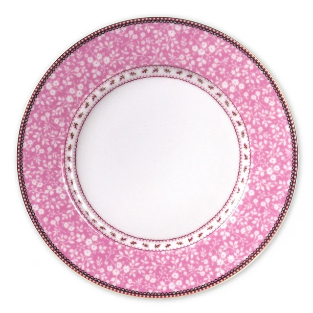 Dieser schöne pinkfarbene Teller wurde mit dem Early Bird Dessin dekoriert: ein Vogel, detaillierter Blütenprint auf Außen- und Innenseite, goldene Details und der typisch rot-weiß gestreifte Pip-Studio-Rand.