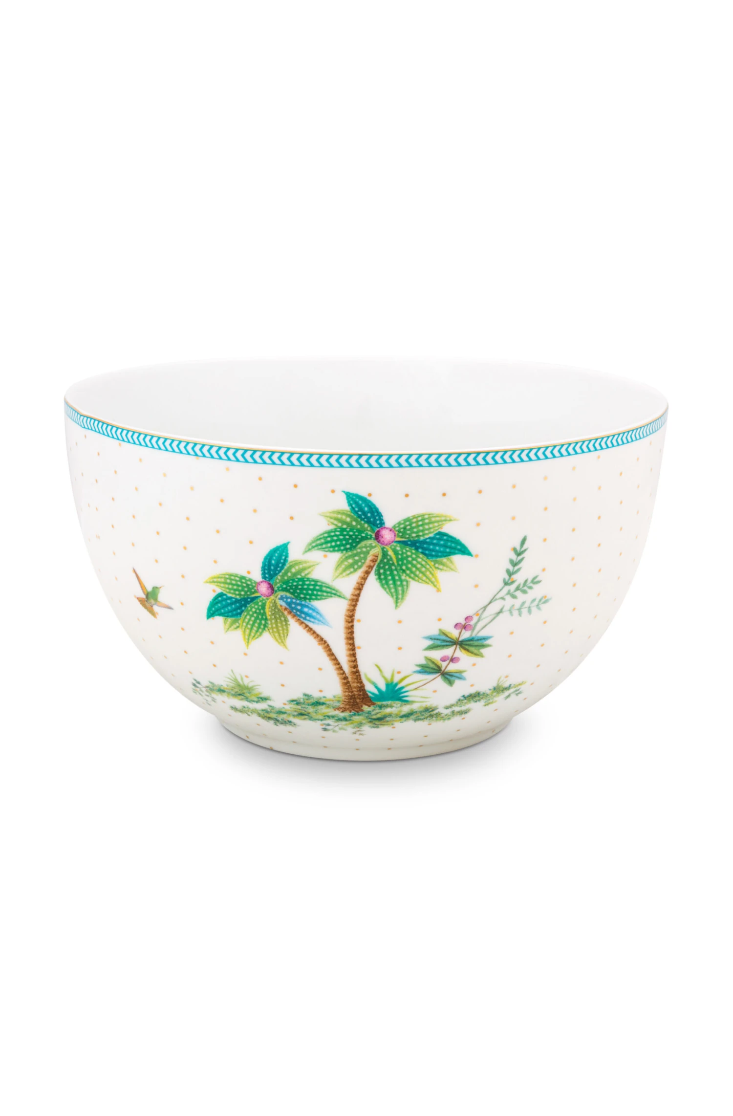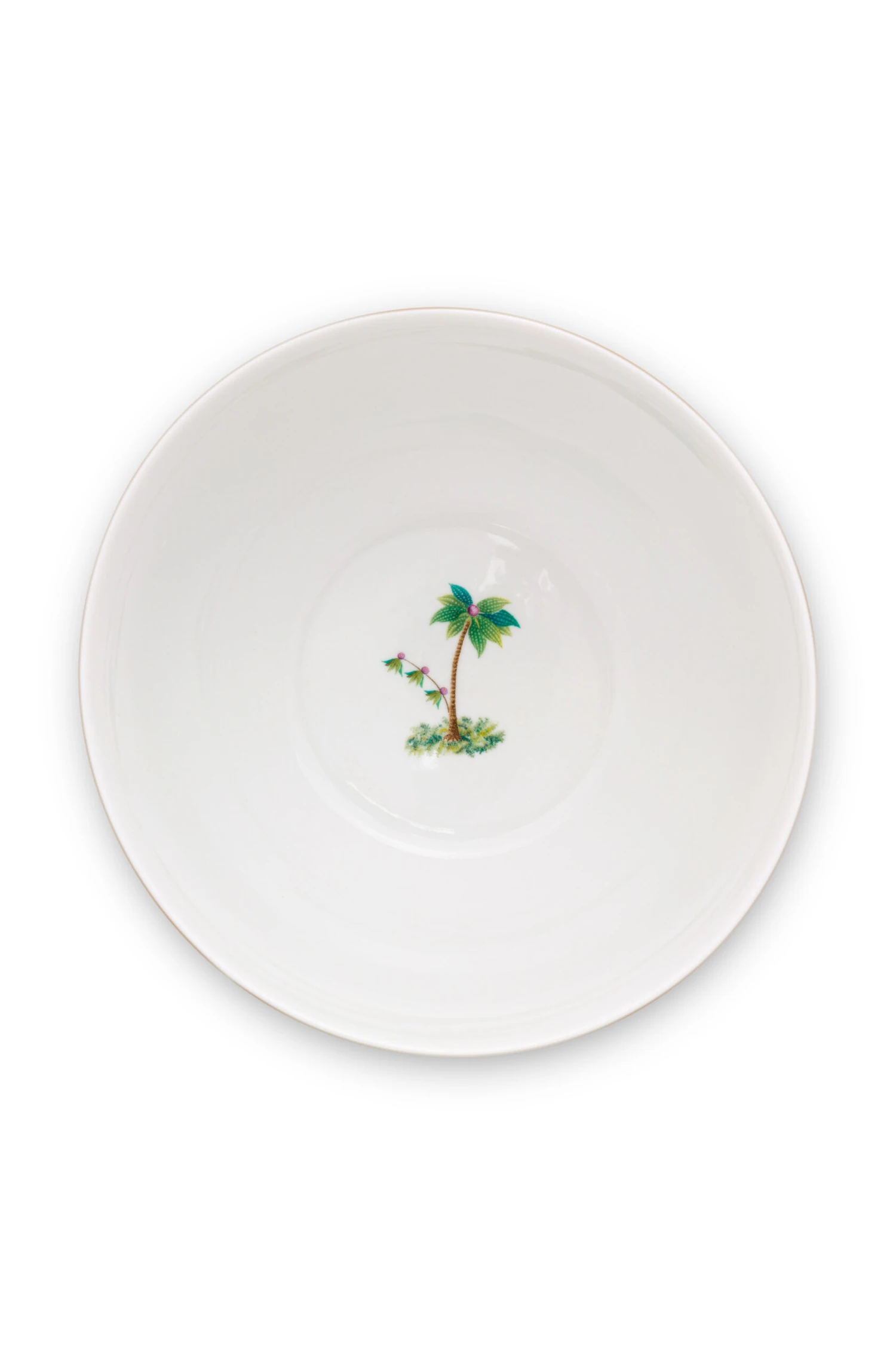 Diese Schale hat einen weißen Hintergrund mit goldenen Punkten und blauen Details. Der Rand wird von einer blauen Linie geziert, außen befinden sich verschiedene exotische Pflanzen.