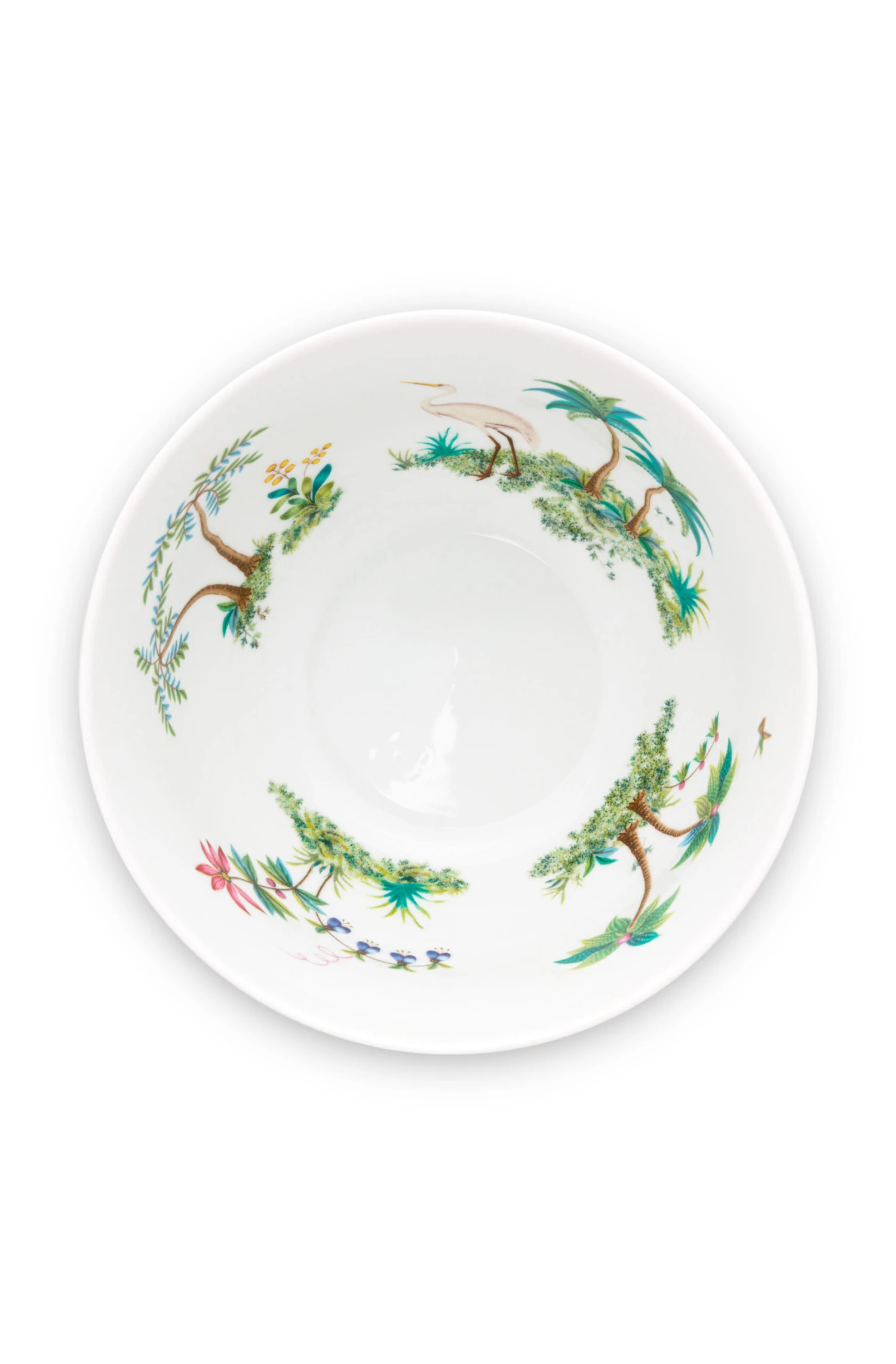 Diese Schale hat einen weißen Hintergrund mit goldenen Punkten und blauen Details. Der Rand wird von einer blauen Linie geziert, im Inneren der Schale befinden sich verschiedene exotische Pflanzen.
