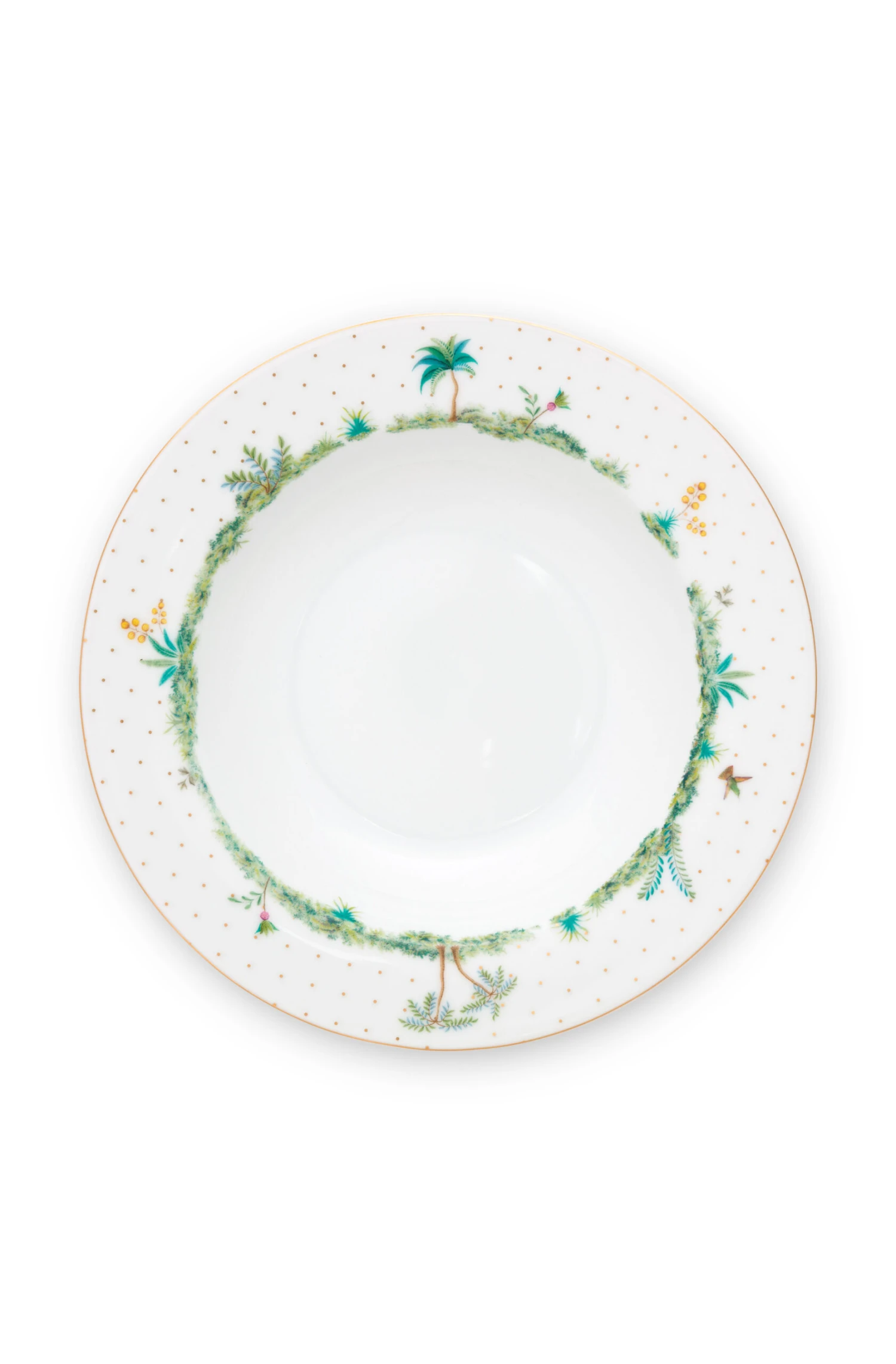 Dieser weiße Suppenteller ist aus hochwertigem Porzellan angefertigt und mit exotischen Pflanzen und goldenen Punkten verziert.