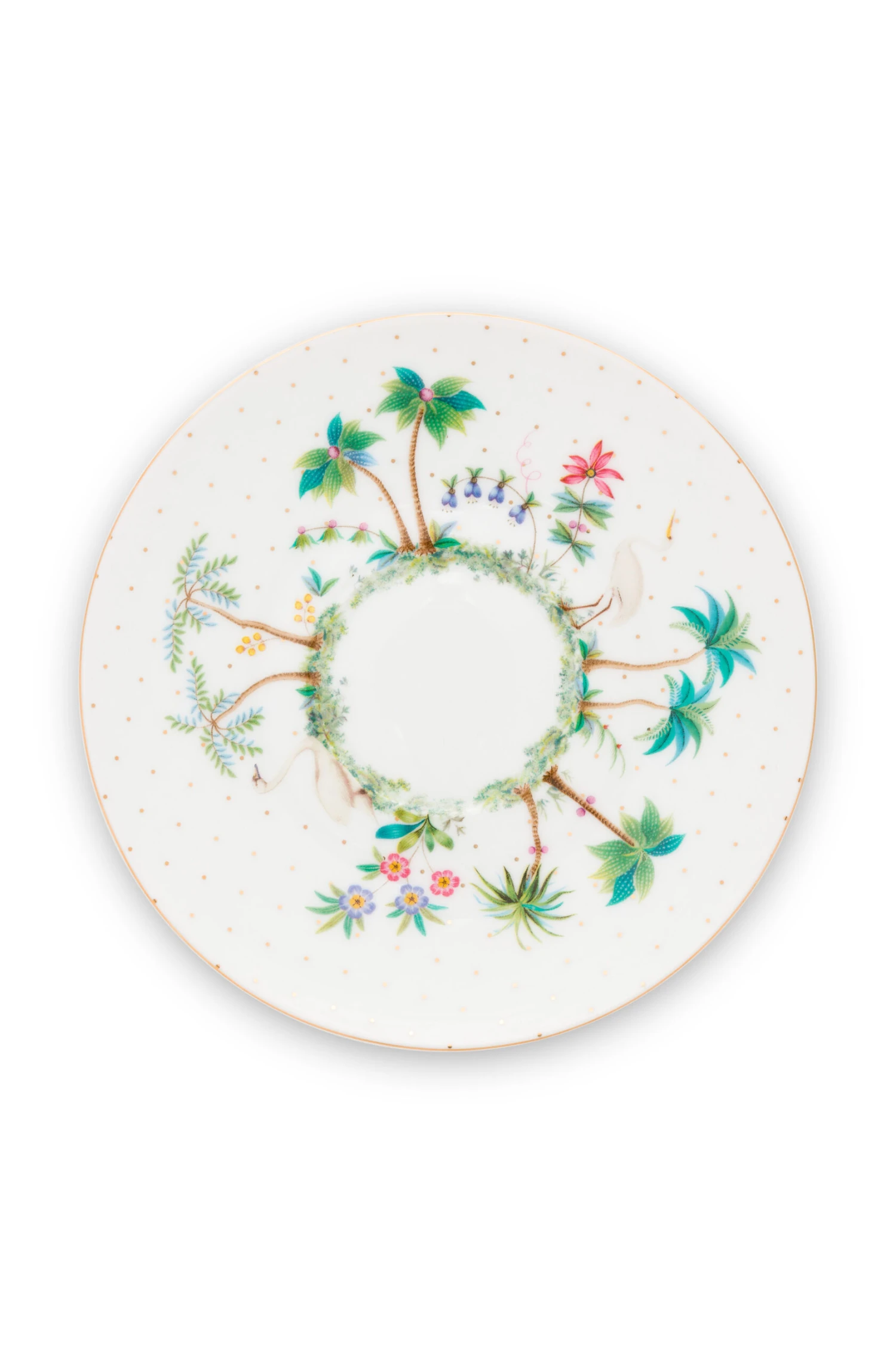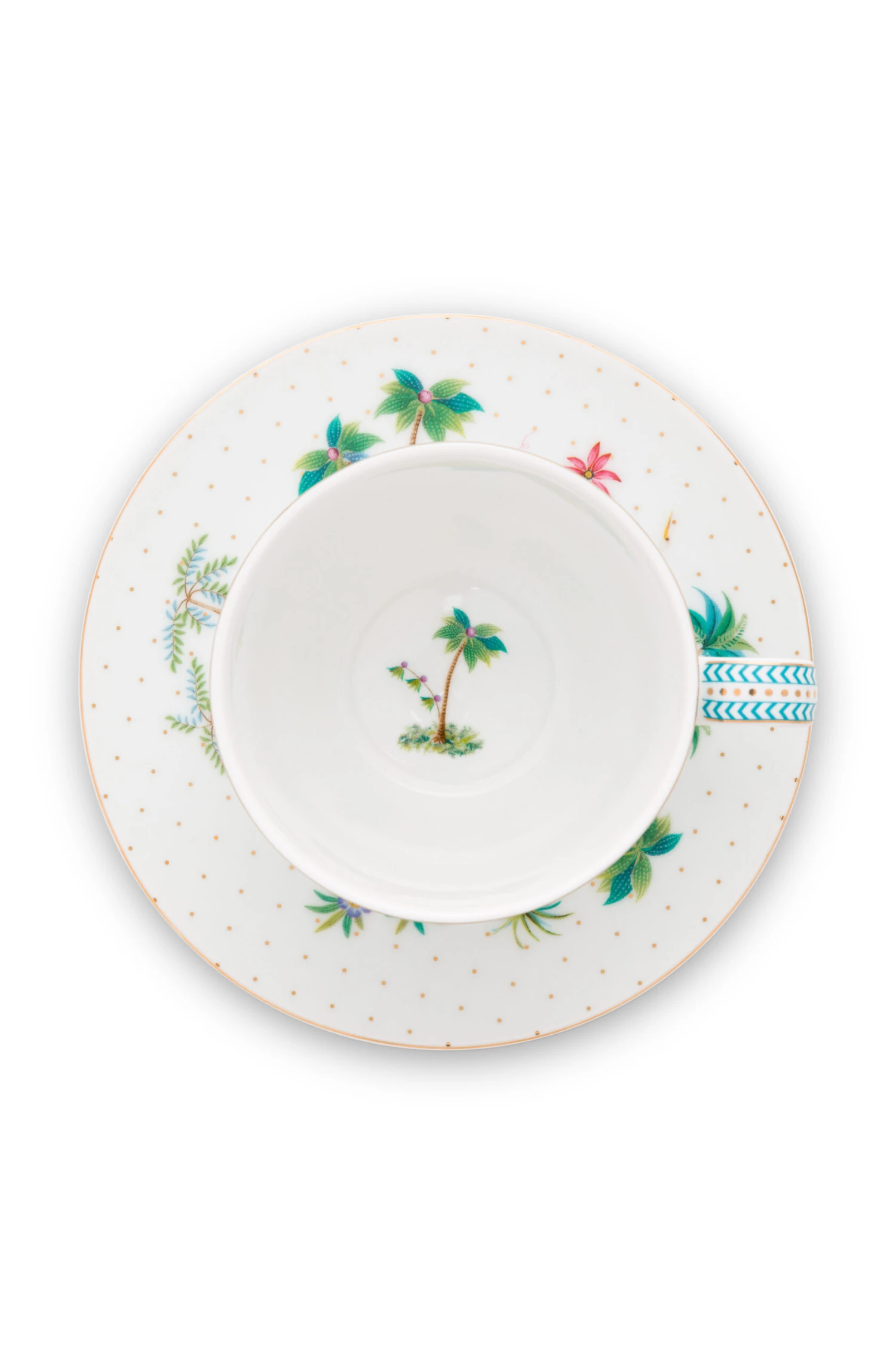 Diese Tasse mit Untertasse hat einen weißen Hintergrund mit goldenen Punkten und blauen Details. Der Rand wird von einer blauen Linie geziert, im Inneren der Schale befinden sich verschiedene exotische Pflanzen.