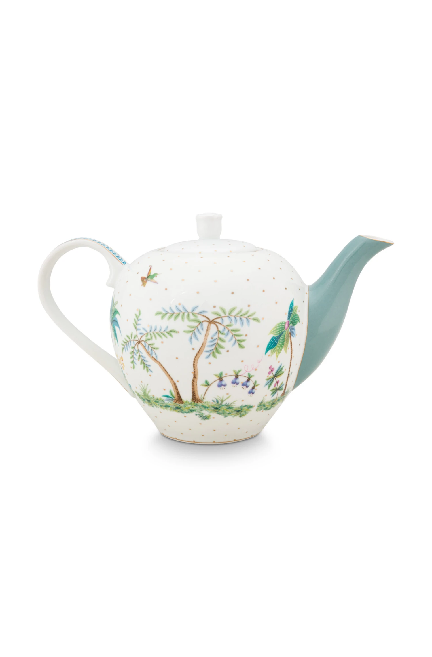 Die Tülle hat eine himmelblaue Farbe, die perfekt zu den tropischen Einflüssen passt. Kombinieren Sie diese Teekanne mit anderen Artikeln aus der Jolie-Kollektion für ein umwerfendes Ergebnis.
