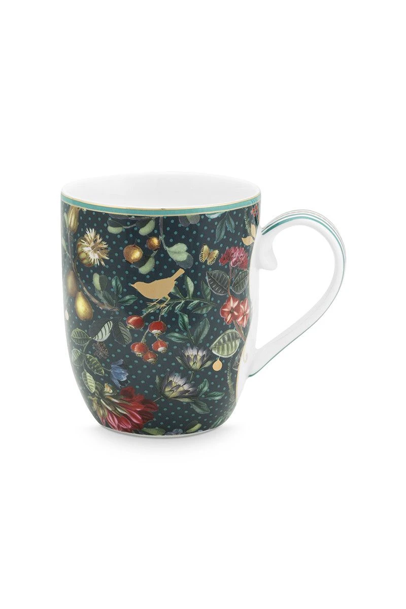 Ein zierlicher dunkelblauer Becher aus unserer Porzellan-Tischwäsche-Serie Winter Wonderland. Dekoriert mit saisonalen Blumen, Eicheln und einem Vogel. Jeder Becher ist mit luxuriösen Elementen verziert, wie z.B. der Goldverzierung am Henkel.
