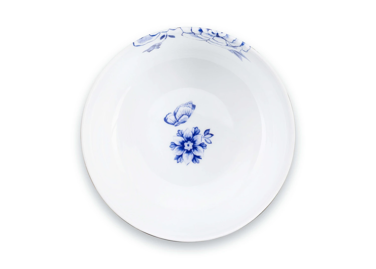 Die Schale ziert ein raffiniertes Design aus subtilen blauen Elementen und goldenen Details. In verschiedenen Größen erhältlich.