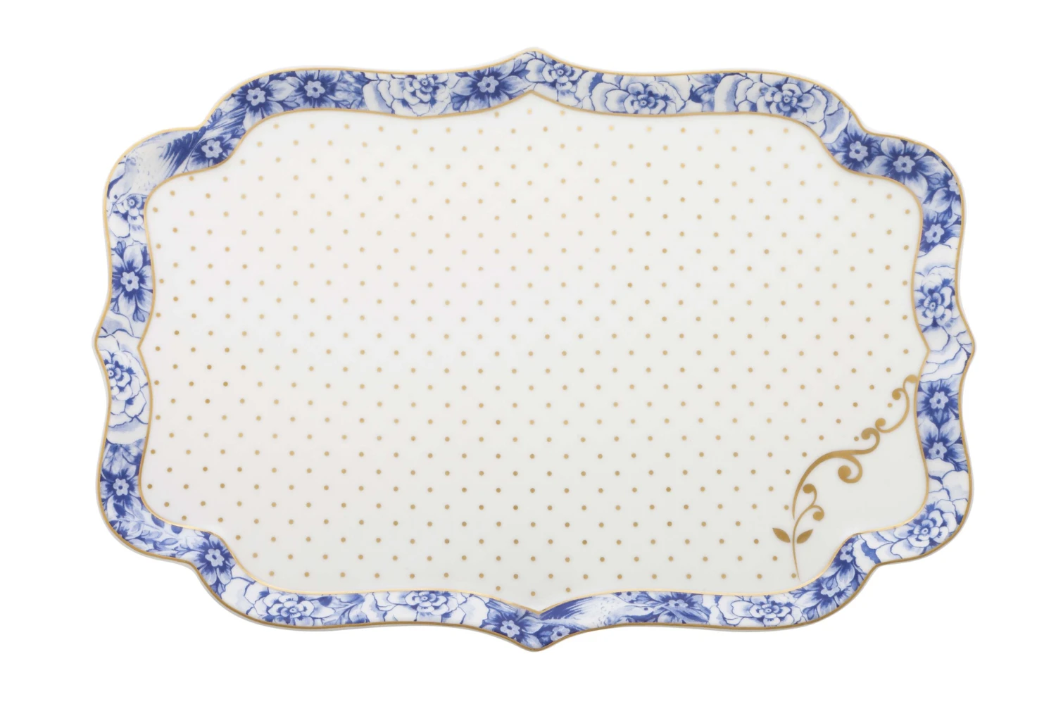 Das Tablett ziert ein raffiniertes Design aus subtilen blauen Elementen und goldenen Details. Eine ideale Ergänzung für Ihr Teegeschirr.