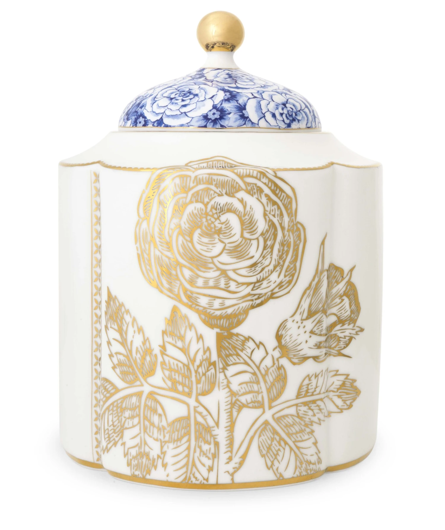 Die mittelgroße Vorratsdose ziert ein raffiniertes Design aus subtilen blauen Elementen und goldenen Details.
